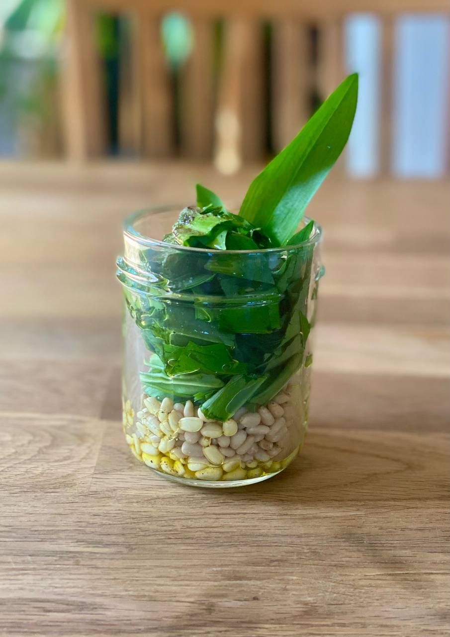 Es ist wieder so weit: überall im Wald grünt es :-) Darunter Bärlauch, der absolute Klassiker unter den Kräutern. Mit nur fünf Zutaten bringst Du viele, leckere Nährstoffe auf Deinen Teller. Du brauchst lediglich frischen Bärlauch, hochwertiges Olivenöl, Nüsse oder Kerne nach Wahl (ich habe Pinienkerne benutzt, aber Cashews und Sonnenblumenkerne passen auch sehr gut) sowie eine Prise Salz und Pfeffer aus der Mühle. Alles kurz waschen, grob zerkleinern und im Mixer zu einem cremigen Pesto verarbeitet. So entsteht ruckzuck ein aromatischer Aufstrich für Pasta, Brot oder Ofengemüse – wie immer natürlich, saisonal und regional.